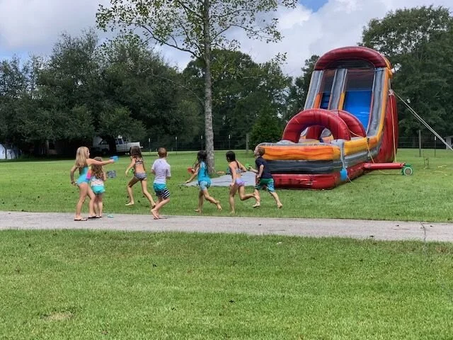 Grandson Benjamin recently celebrated his eighth birthday with a scaled down party. A small group of friends, already in his cluster, were invited to an outside party with a giant blowup water slide. Across the driveway from the rocking chair on my front porch turned out to be the best place for the slide. He began his day as soon as it was installed about 10:45 in the morning, enjoyed time with his brother and friends in the middle, and finished sliding about the time the sun went down with only a brief lunch break.